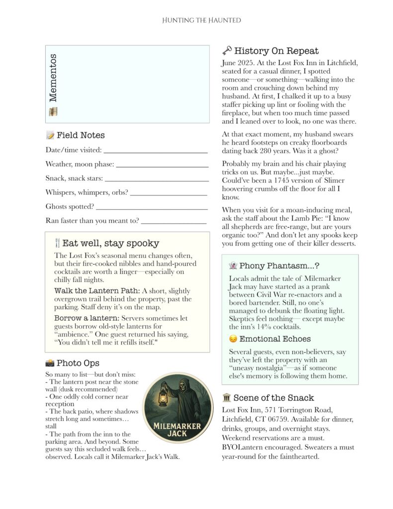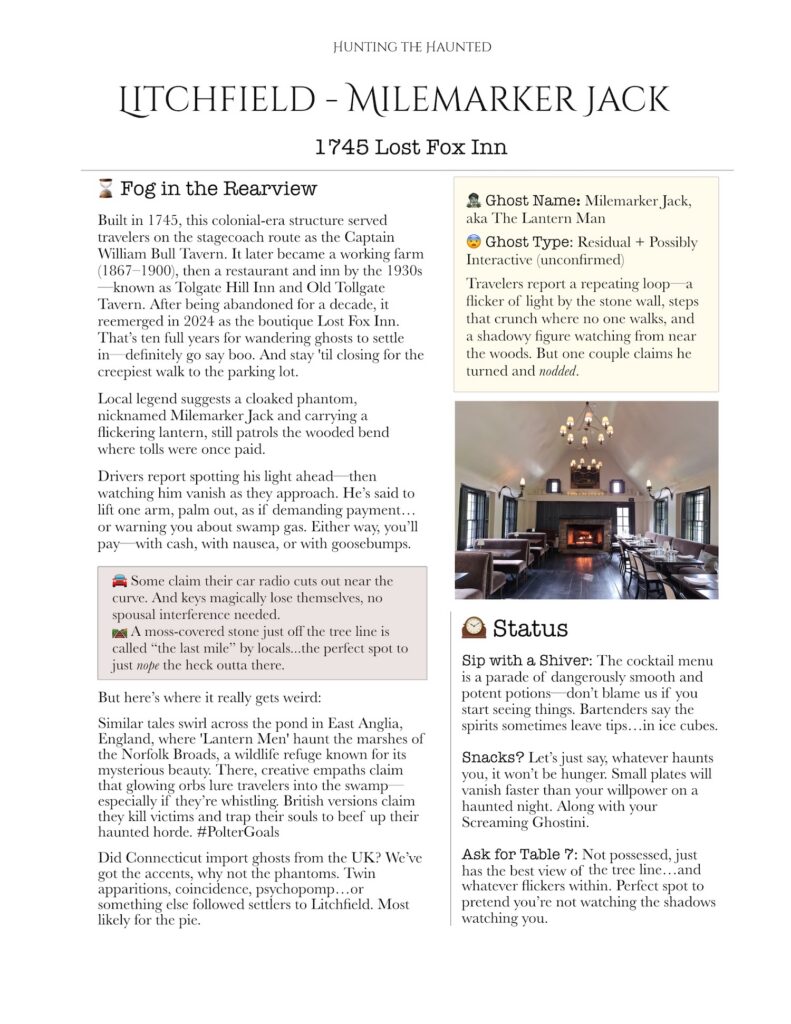 This entry dives into the legend haunting the roadside near the Lost Fox Inn — a lantern-bearing figure with colonial roots, European parallels, and just enough modern weirdness to keep things interesting.